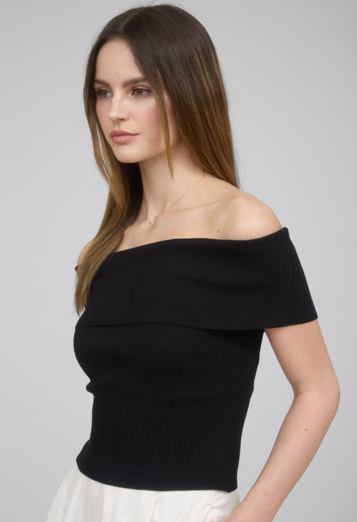 Black ribbed lightweight sweater-like material. Very stretchy. Made to be worn off the shoulder. Slightly shorter in length.