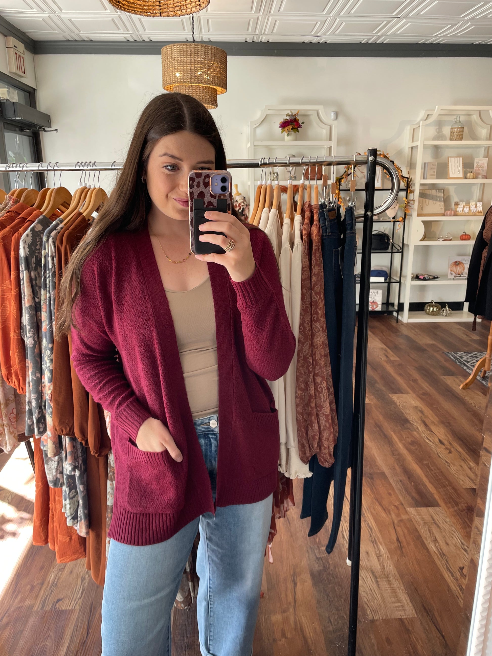 Soft and comfortable waffle cardigan with front pockets. Fitting true to size with room.