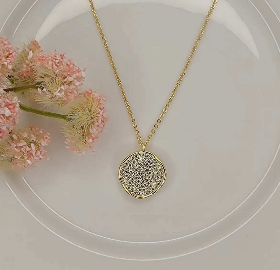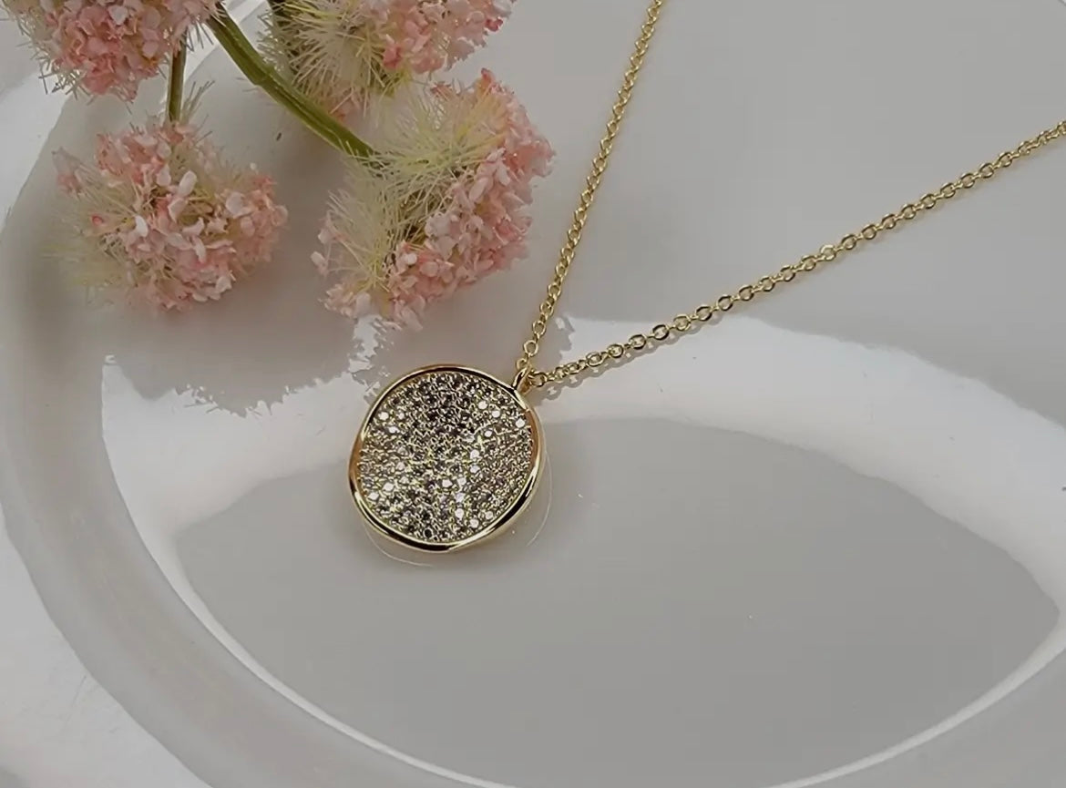 Cave in round pendant necklace. Hypoallergenic, lead & nickel free. Approximately 20” long with extender.
