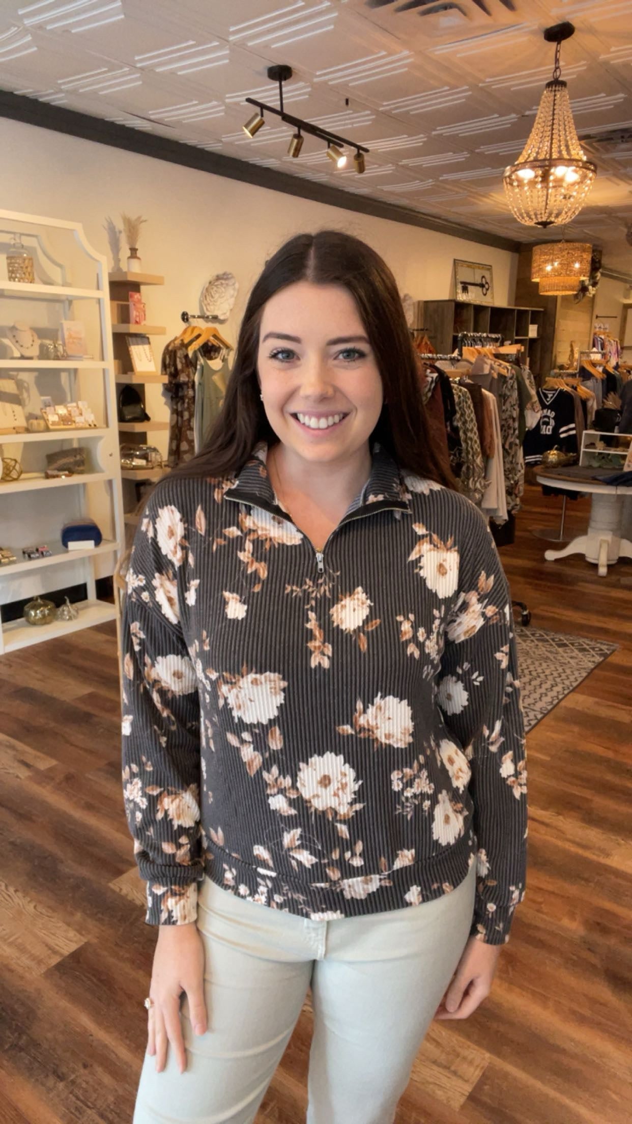 Ribbed quarter zip top with a charcoal background and florals. Silver quarter zip design. Fitting slightly snug. Abigail is pictured in size medium (her typical size). Size up if you prefer a looser fit.