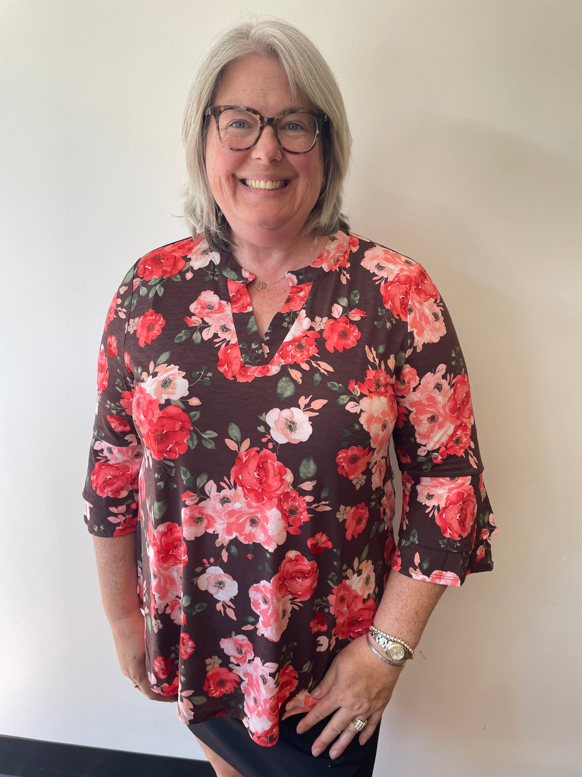 Wrinkle resistant and travel friendly material. Chocolate brown background with red florals. Feminine bell sleeve design. Material has stretch. True to size.