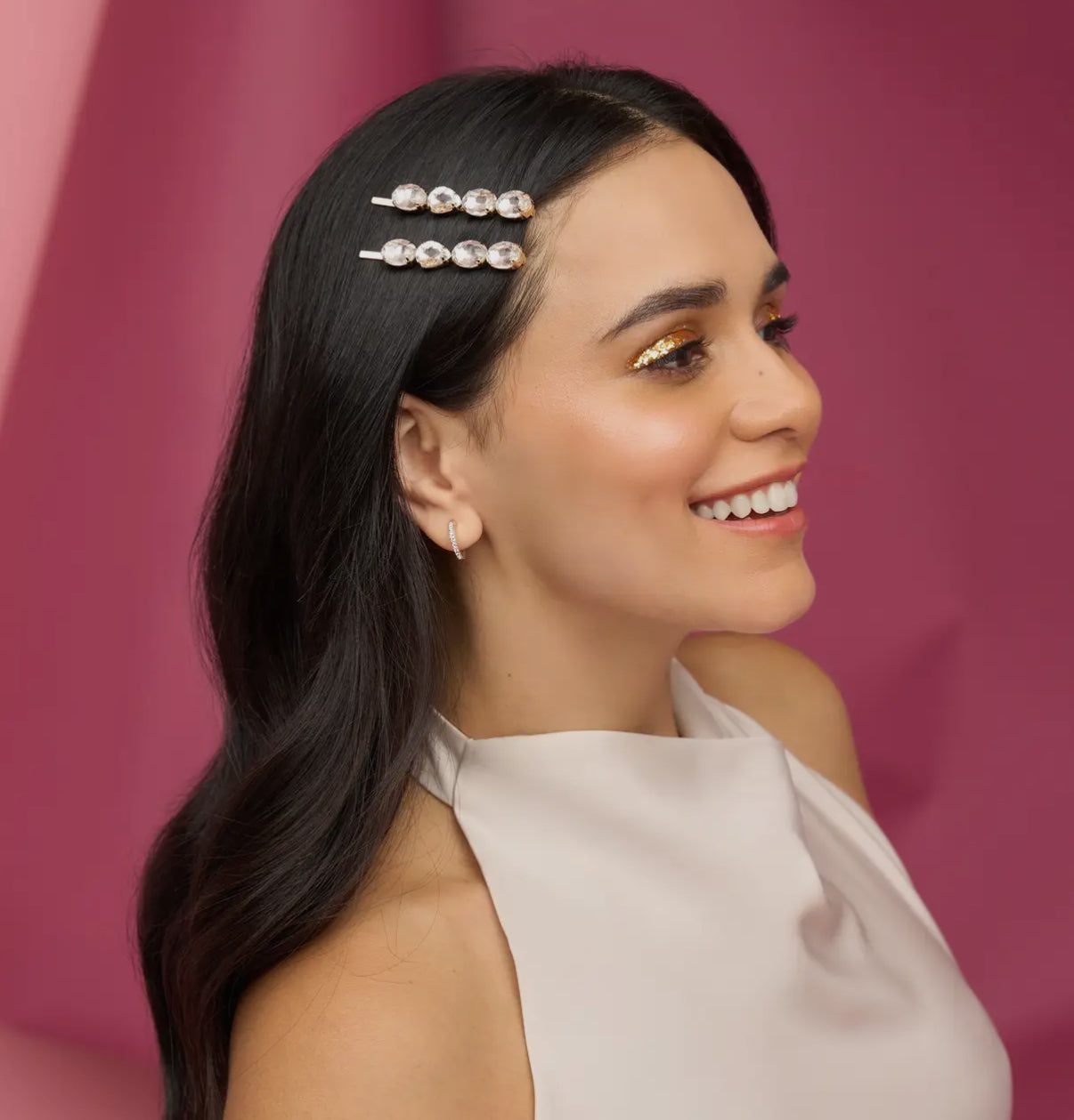 This elegant 2-piece set features sleek, high-shine metal pins accented with delicate gemstones for just the right amount of understated glam. Crafted for a secure, snag-free hold, they’re perfect for pinning back bangs, layers, or flyaways—no slipping, no tugging. Made from high-quality metal to retain shine, shape, and grip over time.