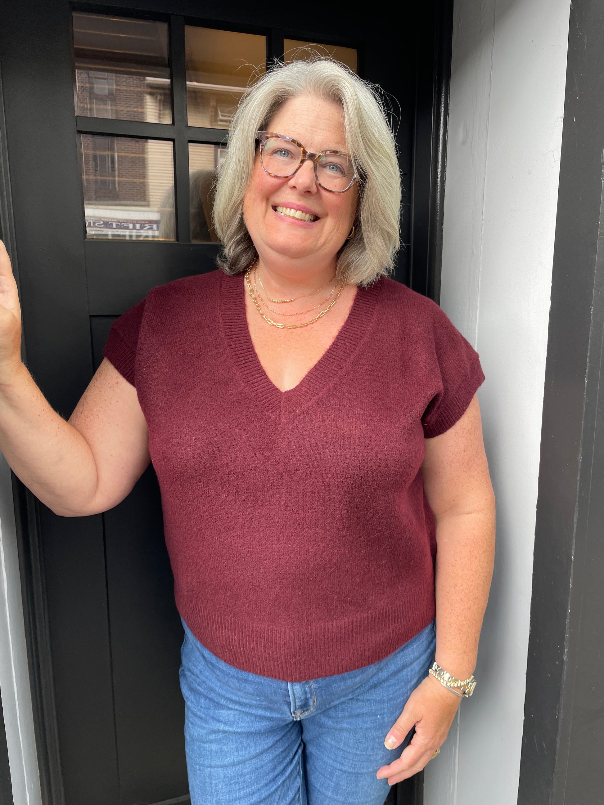 Deep burgundy color short sleeve sweater top. Would look great styled with a long sleeve top underneath as well. Running true to size.