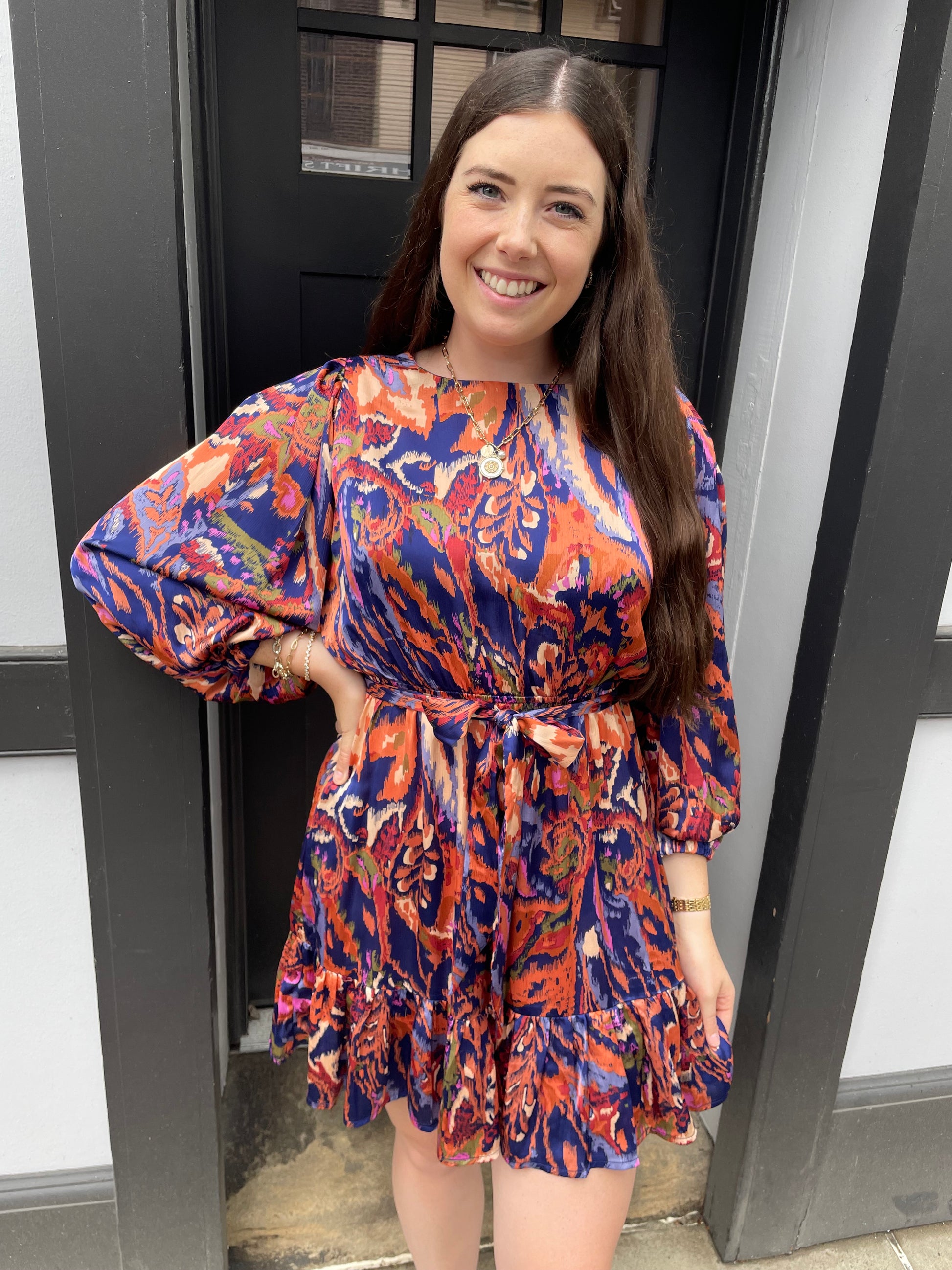 Satin like material and a unique watercolor print! Lots of colors in this piece to mix and match with shoes and jewelry. Running true to size.