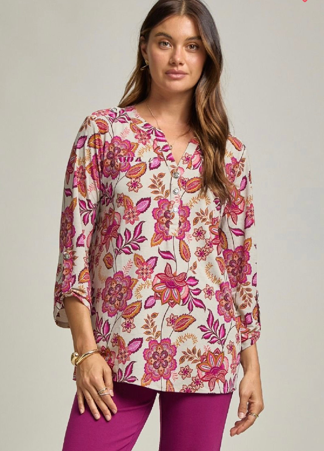 Wrinkle resistant, travel-friendly blouse with neutral stone colored background with pink and orange mix of florals. Has button detailing. Buttons are not functional-they are just for show. Three quarter sleeves. Material has stretch-true to size.