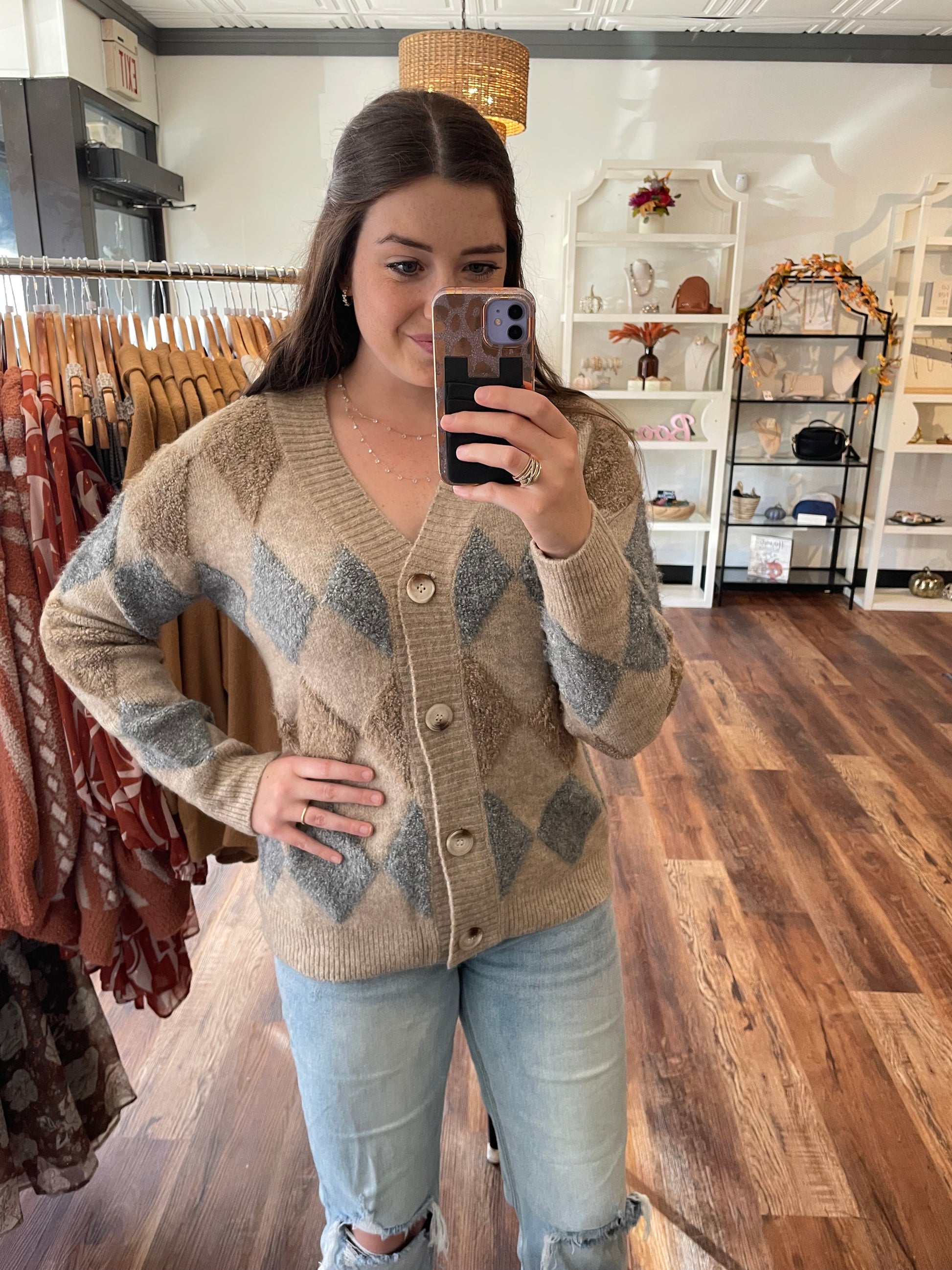Tan and Blue Diamond Pattern Cardigan