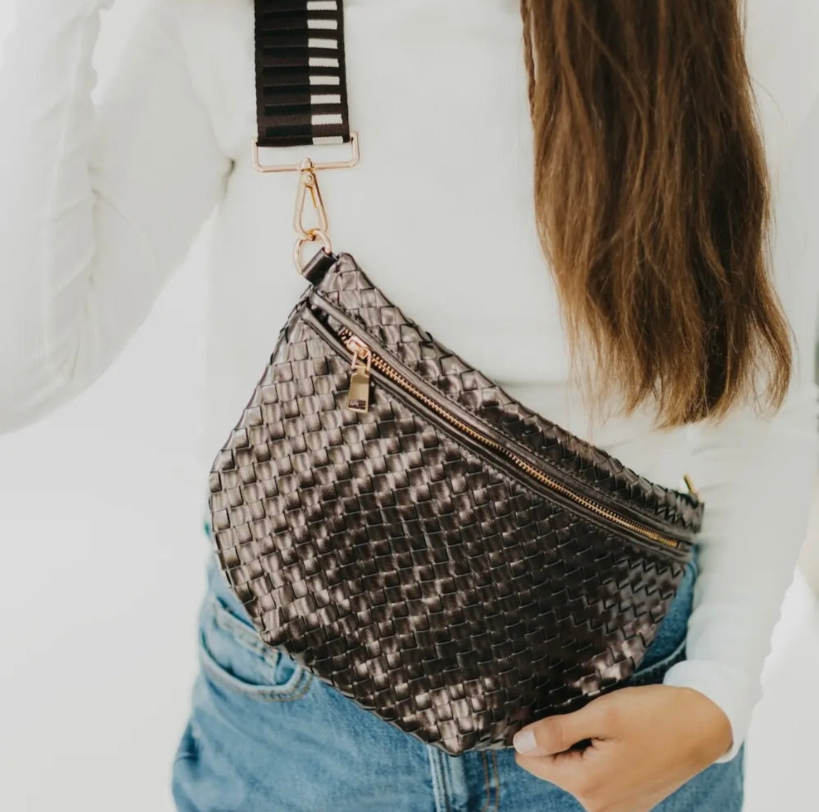 A functional and versatile piece perfect for taking on vacations for hands-free adventures and shopping! Approximately 12” by 8” with an adjustable strap. Vegan leather.